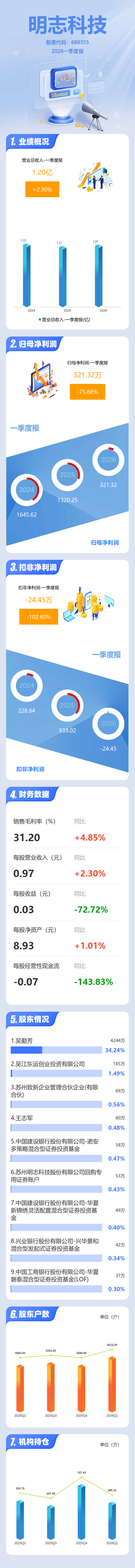 证券之星消息,明志科技2026年一季报显示,一季度公司主营收入1.2亿元,同比上升2.3%;归母净利润321.32万元,同比下降75.66%;扣非净利润-24.45万元,同比下降102.6%;负债率22.62%,投资收益12.13万元,财务费用340.81万元,毛利率31.2%。