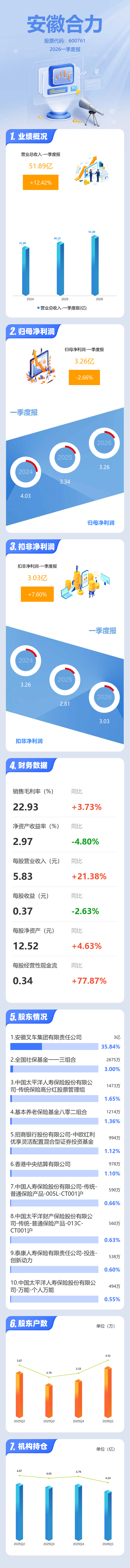 证券之星消息,安徽合力2026年一季报显示,一季度公司主营收入51.89亿元,同比上升12.43%;归母净利润3.26亿元,同比下降2.66%;扣非净利润3.03亿元,同比上升7.6%;负债率42.91%,投资收益1385.65万元,财务费用8118.16万元,毛利率22.93%。