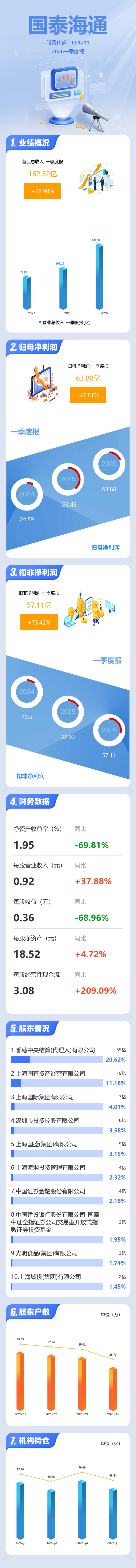 证券之星消息,国泰海通2026年一季报显示,一季度公司主营收入162.32亿元,同比上升58.91%;归母净利润63.88亿元,同比下降47.82%;扣非净利润57.11亿元,同比上升73.43%;负债率84.45%,投资收益15.95亿元。