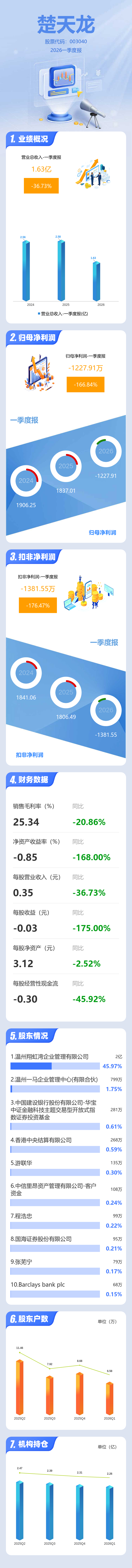 证券之星消息,楚天龙2026年一季报显示,一季度公司主营收入1.63亿元,同比下降36.74%;归母净利润-1227.91万元,同比下降166.84%;扣非净利润-1381.55万元,同比下降176.48%;负债率25.22%,投资收益267.83万元,财务费用-43.01万元,毛利率25.34%。