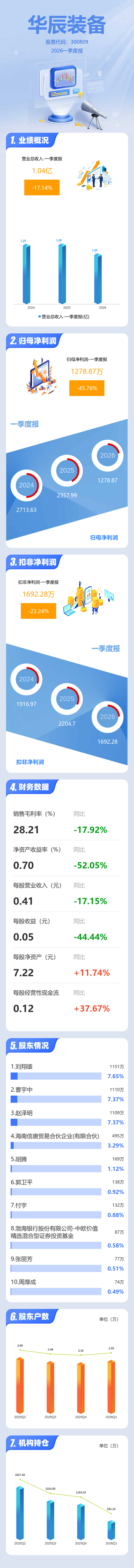 证券之星消息,华辰装备2026年一季报显示,一季度公司主营收入1.04亿元,同比下降17.15%;归母净利润1278.87万元,同比下降45.76%;扣非净利润1692.28万元,同比下降23.24%;负债率21.06%,投资收益239.64万元,财务费用2.65万元,毛利率28.21%。