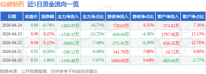 证券之星消息,截至2026年4月24日收盘,仙琚制药(002332)报收于8.89元,下跌0.78%,换手率0.89%,成交量8.77万手,成交额7799.55万元。