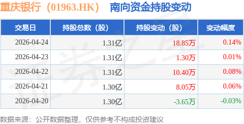 证券之星消息,4月24日南向资金增持18.85万股重庆银行(01963.HK)。近5个交易日中,获南向资金增持的有4天,累计净增持34.95万股。近20个交易日中,获南向资金减持的有11天,累计净减持24.2万股。截至目前,南向资金持有重庆银行(01963.HK)1.31亿股,占公司已发行普通股的8.27%。