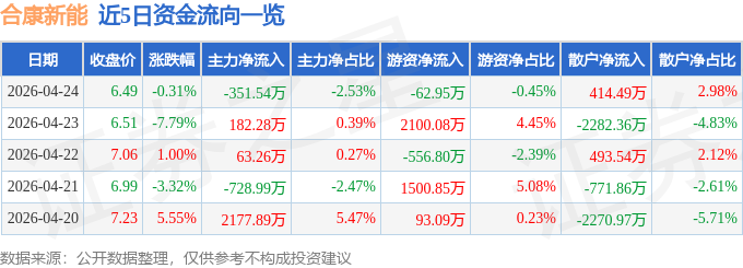 证券之星消息,截至2026年4月24日收盘,合康新能(300048)报收于6.49元,下跌0.31%,换手率1.91%,成交量21.52万手,成交额1.39亿元。