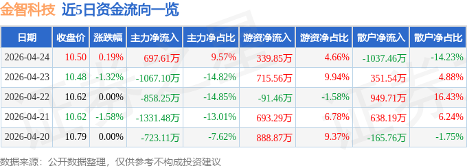 证券之星消息,截至2026年4月24日收盘,金智科技(002090)报收于10.5元,上涨0.19%,换手率1.77%,成交量6.99万手,成交额7289.46万元。