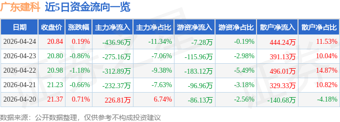 证券之星消息,截至2026年4月24日收盘,广东建科(301632)报收于20.84元,上涨0.19%,换手率2.57%,成交量1.88万手,成交额3853.67万元。