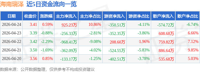 证券之星消息,截至2026年4月24日收盘,海南瑞泽(002596)报收于3.41元,上涨0.59%,换手率2.19%,成交量25.12万手,成交额8521.74万元。