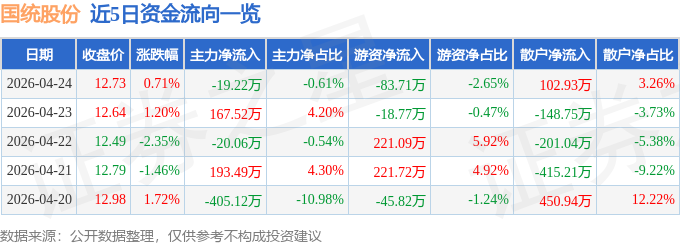 证券之星消息,截至2026年4月24日收盘,国统股份(002205)报收于12.73元,上涨0.71%,换手率1.35%,成交量2.5万手,成交额3158.92万元。