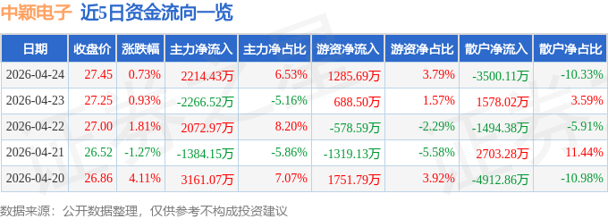 证券之星消息,截至2026年4月24日收盘,中颖电子(300327)报收于27.45元,上涨0.73%,换手率3.63%,成交量12.31万手,成交额3.39亿元。
