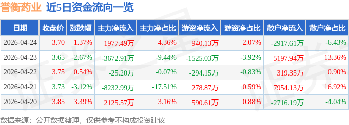 证券之星消息,截至2026年4月24日收盘,誉衡药业(002437)报收于3.7元,上涨1.37%,换手率5.9%,成交量123.13万手,成交额4.54亿元。