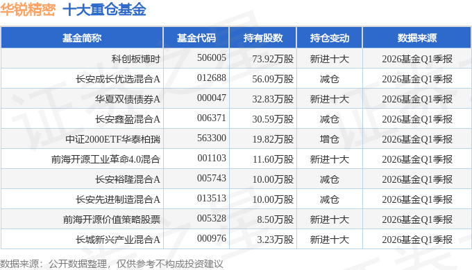 持有华锐精密最多的基金为科创板博时,目前规模为21.55亿元,最新净值1.5073(4月23日),较上一交易日下跌2.05%,近一年上涨67.09%。该基金现任基金经理为肖瑞瑾。
