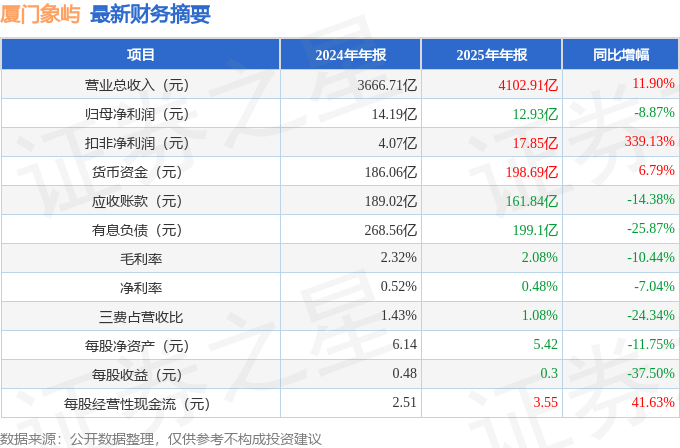 据证券之星公开数据整理,近期厦门象屿(600057)发布2025年年报。截至本报告期末,公司营业总收入4102.91亿元,同比上升11.9%,归母净利润12.93亿元,同比下降8.87%。按单季度数据看,第四季度营业总收入934.27亿元,同比上升35.46%,第四季度归母净利润-3.4亿元,同比下降164.33%。本报告期厦门象屿公司应收账款体量较大,当期应收账款占最新年报归母净利润比达1251.69%。