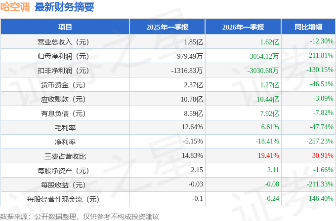 据证券之星公开数据整理,近期哈空调(600202)发布2026年一季报。截至本报告期末,公司营业总收入1.62亿元,同比下降12.3%,归母净利润-3054.12万元,同比下降211.81%。按单季度数据看,第一季度营业总收入1.62亿元,同比下降12.3%,第一季度归母净利润-3054.12万元,同比下降211.81%。本报告期哈空调三费占比上升明显,财务费用、销售费用和管理费用总和占总营收同比增幅达30.91%。