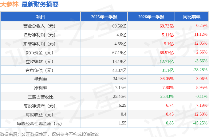 据证券之星公开数据整理,近期大参林(603233)发布2026年一季报。截至本报告期末,公司营业总收入69.73亿元,同比上升0.25%,归母净利润5.11亿元,同比上升11.12%。按单季度数据看,第一季度营业总收入69.73亿元,同比上升0.25%,第一季度归母净利润5.11亿元,同比上升11.12%。本报告期大参林盈利能力上升,毛利率同比增幅3.06%,净利率同比增幅8.95%。