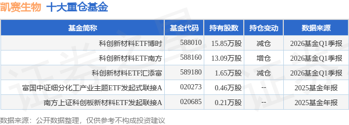 持有凯赛生物最多的基金为科创新材料ETF博时,目前规模为2.02亿元,最新净值1.0027(4月23日),较上一交易日下跌1.33%,近一年上涨69.46%。该基金现任基金经理为唐屹兵。