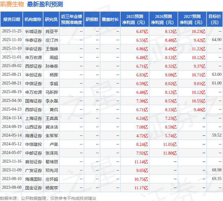 据证券之星公开数据整理,近期凯赛生物(688065)发布2025年年报。截至本报告期末,公司营业总收入32.95亿元,同比上升11.4%,归母净利润5.61亿元,同比上升14.68%。按单季度数据看,第四季度营业总收入7.5亿元,同比上升0.97%,第四季度归母净利润1.1亿元,同比下降23.46%。本报告期凯赛生物盈利能力上升,毛利率同比增幅9.5%,净利率同比增幅0.16%。