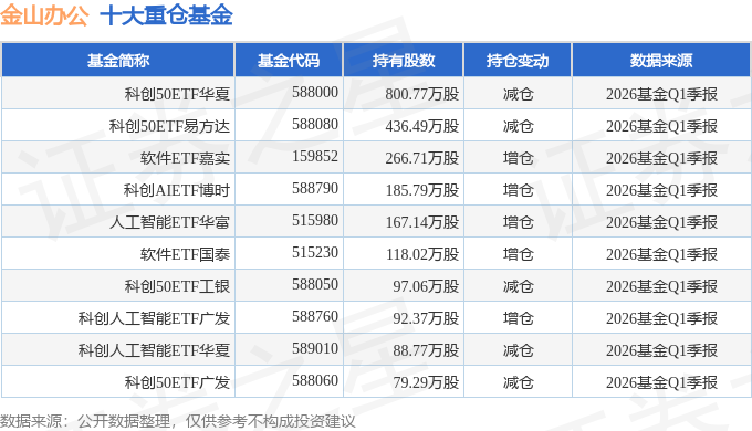 持有金山办公最多的基金为科创50ETF华夏,目前规模为685.48亿元,最新净值1.5097(4月23日),较上一交易日下跌1.27%,近一年上涨42.09%。该基金现任基金经理为荣膺。