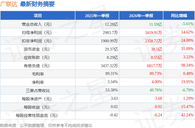 据证券之星公开数据整理,近期广联达(002410)发布2026年一季报。截至本报告期末,公司营业总收入11.59亿元,同比下降5.61%,归母净利润3419.91万元,同比上升14.62%。按单季度数据看,第一季度营业总收入11.59亿元,同比下降5.61%,第一季度归母净利润3419.91万元,同比上升14.62%。本报告期广联达盈利能力上升,毛利率同比增幅0.48%,净利率同比增幅19.95%。