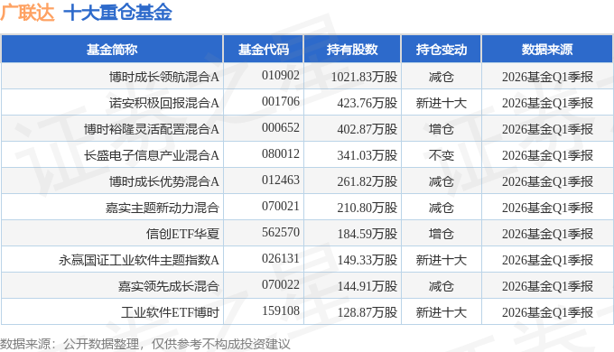 持有广联达最多的基金为博时成长领航混合A,目前规模为27.04亿元,最新净值0.8346(4月24日),较上一交易日下跌0.58%,近一年上涨21.6%。该基金现任基金经理为陈鹏扬 郭康斌。