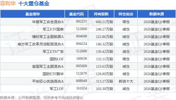 持有菲利华最多的基金为华夏军工安全混合A,目前规模为48.39亿元,最新净值2.41(4月24日),较上一交易日下跌1.87%,近一年上涨80.46%。该基金现任基金经理为万方方。