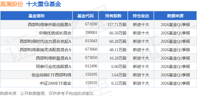 持有高澜股份最多的基金为西部利得事件驱动股票A,目前规模为8.79亿元,最新净值4.5833(4月23日),较上一交易日下跌2.09%,近一年上涨80.74%。该基金现任基金经理为张昌平。