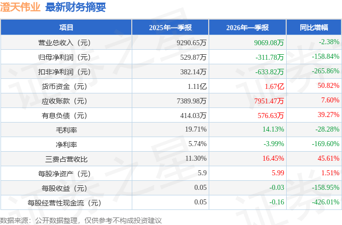 据证券之星公开数据整理,近期澄天伟业(300689)发布2026年一季报。截至本报告期末,公司营业总收入9069.08万元,同比下降2.38%,归母净利润-311.78万元,同比下降158.84%。按单季度数据看,第一季度营业总收入9069.08万元,同比下降2.38%,第一季度归母净利润-311.78万元,同比下降158.84%。本报告期澄天伟业三费占比上升明显,财务费用、销售费用和管理费用总和占总营收同比增幅达45.61%。