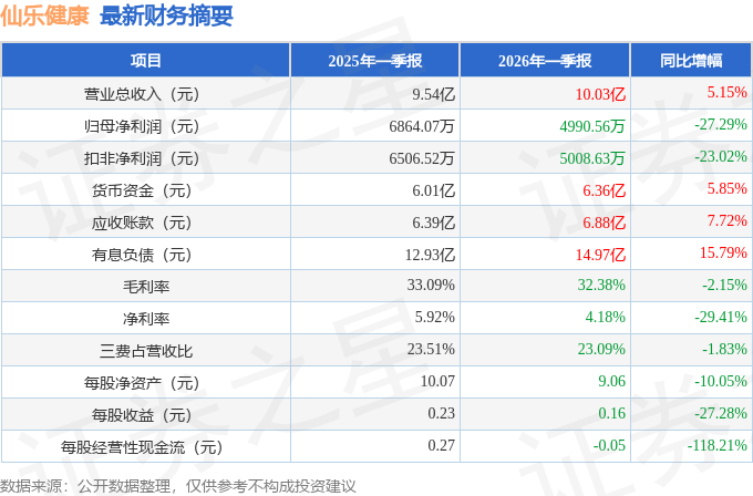 据证券之星公开数据整理,近期仙乐健康(300791)发布2026年一季报。截至本报告期末,公司营业总收入10.03亿元,同比上升5.15%,归母净利润4990.56万元,同比下降27.29%。按单季度数据看,第一季度营业总收入10.03亿元,同比上升5.15%,第一季度归母净利润4990.56万元,同比下降27.29%。本报告期仙乐健康公司应收账款体量较大,当期应收账款占最新年报归母净利润比达503.99%。