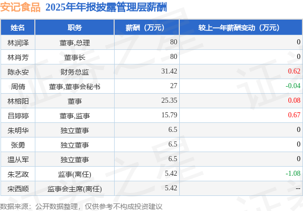 证券之星消息,安记食品发布2025年年报,数据显示:公司主营收入5.85亿元,同比增8.8%。归母净利润为2749.45万元,同比减23.57%。扣非净利润为2166.07万元,同比减25.59%。当年公司员工总数329人,同比增5.79%。人均薪酬13.97万元(注:"人均薪酬"根据定期报告中"应付职工薪酬"附注的本期增加值 / 员工总数计算而来),同比增3.25%。人均创收177.96万元,同比减8.75%。人均创利8.36万元,同比减32.2%。其中管理层薪酬总额为289.9万元,同比上一年增0.19%,薪酬最高的为董事,总理林润泽,薪酬80.0万元。