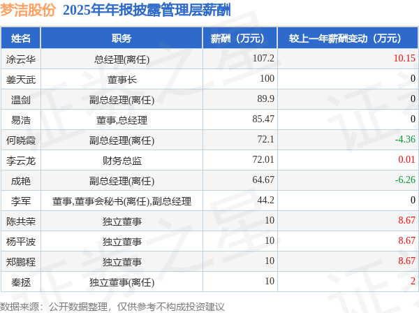 证券之星消息,梦洁股份发布2025年年报,数据显示:公司主营收入16.79亿元,同比减1.94%。归母净利润为4767.04万元,同比增79.58%。扣非净利润为3492.71万元,同比增161.71%。当年公司员工总数2567人,同比减5.35%。人均薪酬11.74万元(注:"人均薪酬"根据定期报告中"应付职工薪酬"附注的本期增加值 / 员工总数计算而来),同比增1.89%。人均创收65.42万元,同比增3.6%。人均创利1.84万元,同比增92.34%。其中管理层薪酬总额为675.55万元,同比上一年减3.58%,薪酬最高的为总经理(离任)涂云华,薪酬107.2万元。