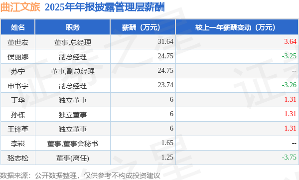 证券之星消息,曲江文旅发布2025年年报,数据显示:公司主营收入9.67亿元,同比减22.83%。归母净利润为-1.96亿元,同比减49.43%。扣非净利润为-2.96亿元,同比减125.9%。当年公司员工总数2427人,同比减15.99%。人均薪酬13.04万元(注:"人均薪酬"根据定期报告中"应付职工薪酬"附注的本期增加值 / 员工总数计算而来),同比减5.54%。人均创收39.84万元,同比减8.15%。其中管理层薪酬总额为125.78万元,同比上一年减46.18%,薪酬最高的为董事,总经理董世宏,薪酬31.64万元。