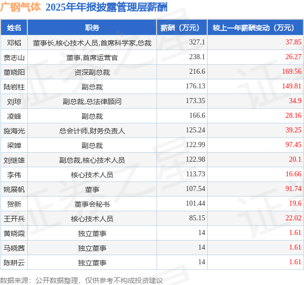 证券之星消息,广钢气体发布2025年年报,数据显示:公司主营收入24.24亿元,同比增15.26%。归母净利润为2.86亿元,同比增15.21%。扣非净利润为2.57亿元,同比增12.16%。当年公司员工总数1112人,同比增1.18%。人均薪酬31.12万元(注:"人均薪酬"根据定期报告中"应付职工薪酬"附注的本期增加值 / 员工总数计算而来),同比增10.63%。人均创收218.03万元,同比增13.91%。人均创利25.97万元,同比增14.38%。其中管理层薪酬总额为2118.95万元,同比上一年增42.91%,薪酬最高的为董事长,核心技术人员,首席科学家,总裁邓韬,薪酬327.1万元。