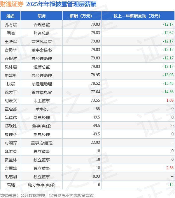 证券之星消息,财通证券发布2025年年报,数据显示:公司主营收入69.22亿元,同比增10.13%。归母净利润为26.32亿元,同比增12.5%。扣非净利润为25.92亿元,同比增14.77%。当年公司员工总数4659人,同比减2.9%。人均薪酬50.84万元(注:"人均薪酬"根据定期报告中"应付职工薪酬"附注的本期增加值 / 员工总数计算而来),同比增13.98%。人均创收148.58万元,同比增13.41%。人均创利56.49万元,同比增15.88%。其中管理层薪酬总额为1082.99万元,同比上一年减28.5%,薪酬最高的为合规总监孔万斌,薪酬79.83万元。