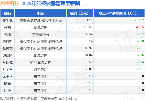 证券之星消息,光格科技发布2025年年报,数据显示:公司主营收入2.16亿元,同比增18.18%。归母净利润为-6678.38万元,同比增1.16%。扣非净利润为-7615.8万元,同比减5.33%。当年公司员工总数343人,同比减4.46%。人均薪酬31.6万元(注:"人均薪酬"根据定期报告中"应付职工薪酬"附注的本期增加值 / 员工总数计算而来),同比增5.84%。人均创收62.87万元,同比增23.69%。其中管理层薪酬总额为738.16万元,同比上一年减14.52%,薪酬最高的为董事长,总经理,核心技术人员姜明武,薪酬117.7万元。