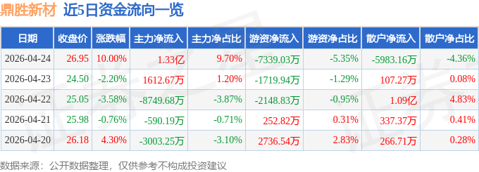 证券之星消息,截至2026年4月24日收盘,鼎胜新材(603876)报收于26.95元,上涨10.0%,涨停,换手率5.67%,成交量52.68万手,成交额13.73亿元。
