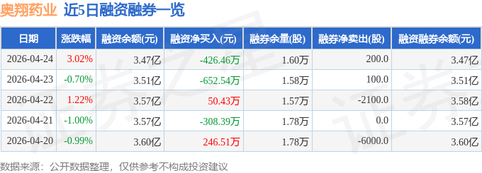 奥翔药业融资融券信息显示,融资方面,当日融资买入824.39万元,融资偿还1250.85万元,融资净偿还426.46万元。融券方面,融券卖出1000.0股,融券偿还800.0股,融券余量1.6万股,融券余额16.38万元。融资融券余额3.47亿元。