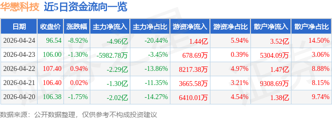 证券之星消息,截至2026年4月24日收盘,华懋科技(603306)报收于96.54元,下跌8.92%,换手率7.49%,成交量24.67万手,成交额24.24亿元。