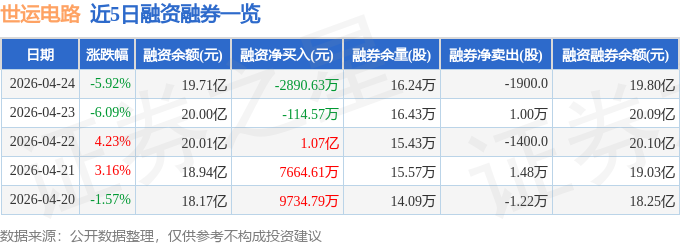 证券之星消息,截至2026年4月24日收盘,世运电路(603920)报收于55.26元,下跌5.92%,换手率5.95%,成交量42.85万手,成交额24.03亿元。
