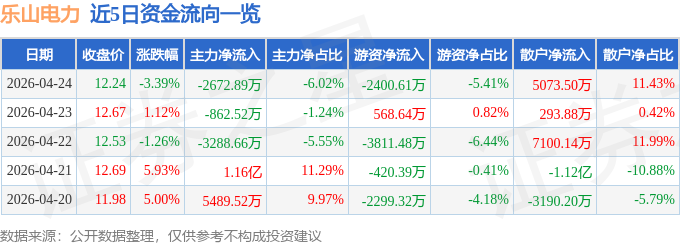 证券之星消息,截至2026年4月24日收盘,乐山电力(600644)报收于12.24元,下跌3.39%,换手率6.19%,成交量35.82万手,成交额4.44亿元。