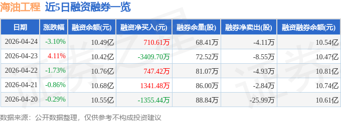 证券之星消息,截至2026年4月24日收盘,海油工程(600583)报收于6.87元,下跌3.1%,换手率1.04%,成交量46.15万手,成交额3.21亿元。