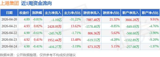 资金流向数据方面,本周上港集团主力资金合计净流出7835.26万元,游资资金合计净流入7169.25万元,散户资金合计净流入666.01万元。本周资金流向一览见下表: