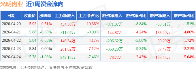 资金流向数据方面,本周光明肉业主力资金合计净流入309.49万元,游资资金合计净流出723.4万元,散户资金合计净流入413.9万元。本周资金流向一览见下表: