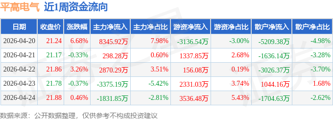 资金流向数据方面,本周平高电气主力资金合计净流入6307.45万元,游资资金合计净流入4224.91万元,散户资金合计净流出1.05亿元。本周资金流向一览见下表: