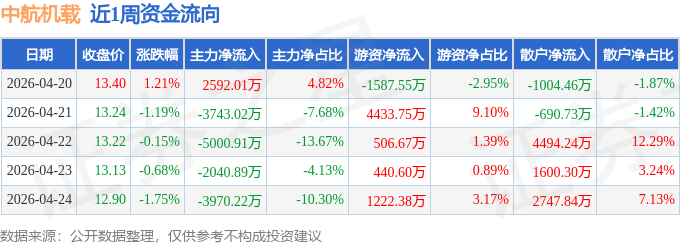 资金流向数据方面,本周中航机载主力资金合计净流出1.22亿元,游资资金合计净流入5015.85万元,散户资金合计净流入7147.18万元。本周资金流向一览见下表: