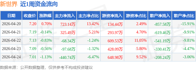 资金流向数据方面,本周新世界主力资金合计净流入441.87万元,游资资金合计净流入2115.01万元,散户资金合计净流出2556.88万元。本周资金流向一览见下表: