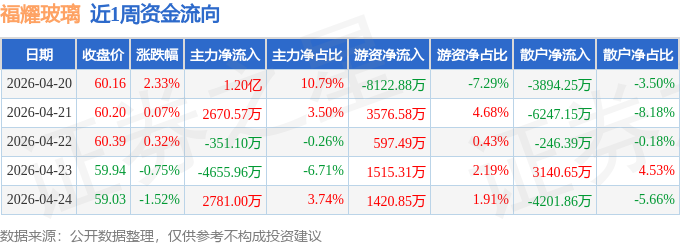 证券之星消息,截至2026年4月24日收盘,福耀玻璃(600660)报收于59.03元,较上周的58.79元上涨0.41%。本周,福耀玻璃4月21日盘中最高价报61.1元。4月22日盘中最低价报58.21元。福耀玻璃当前最新总市值1540.53亿元,在汽车零部件板块市值排名2/239,在两市A股市值排名116/5200。