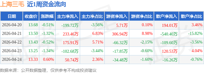 资金流向数据方面,本周上海三毛主力资金合计净流入157.71万元,游资资金合计净流入194.01万元,散户资金合计净流出351.72万元。本周资金流向一览见下表: