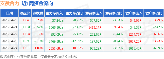 资金流向数据方面,本周安徽合力主力资金合计净流出3014.02万元,游资资金合计净流出486.2万元,散户资金合计净流入3500.23万元。本周资金流向一览见下表: