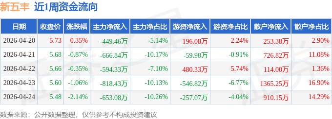 资金流向数据方面,本周新五丰主力资金合计净流出3182.15万元,游资资金合计净流出187.46万元,散户资金合计净流入3369.61万元。本周资金流向一览见下表: