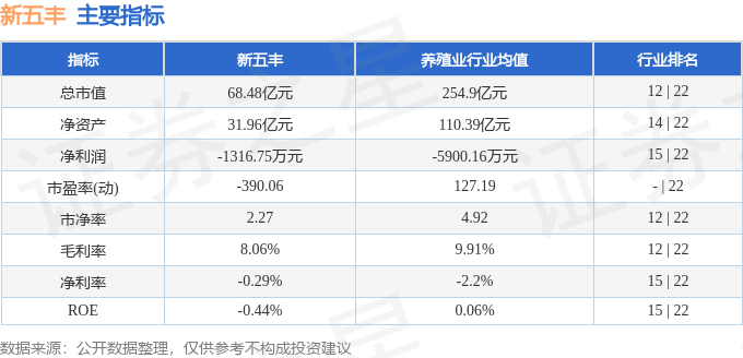 新五丰(600975)主营业务:生猪养殖、肉品销售以及饲料加工。 新五丰2025年三季报显示,前三季度公司主营收入53.9亿元,同比上升2.27%;归母净利润-1316.75万元,同比下降1171.47%;扣非净利润-2456.27万元,同比下降291.8%;其中2025年第三季度,公司单季度主营收入17.02亿元,同比下降16.47%;单季度归母净利润-5840.19万元,同比下降123.53%;单季度扣非净利润-6700.99万元,同比下降127.44%;负债率73.22%,投资收益-56.94万元,财务费用1.81亿元,毛利率8.06%。