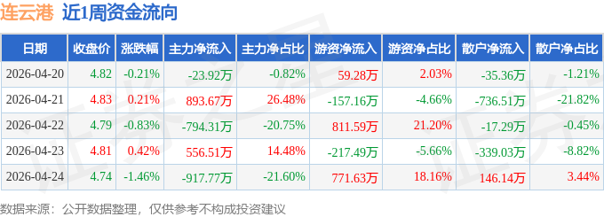 资金流向数据方面,本周连云港主力资金合计净流出285.81万元,游资资金合计净流入1267.86万元,散户资金合计净流出982.04万元。本周资金流向一览见下表: